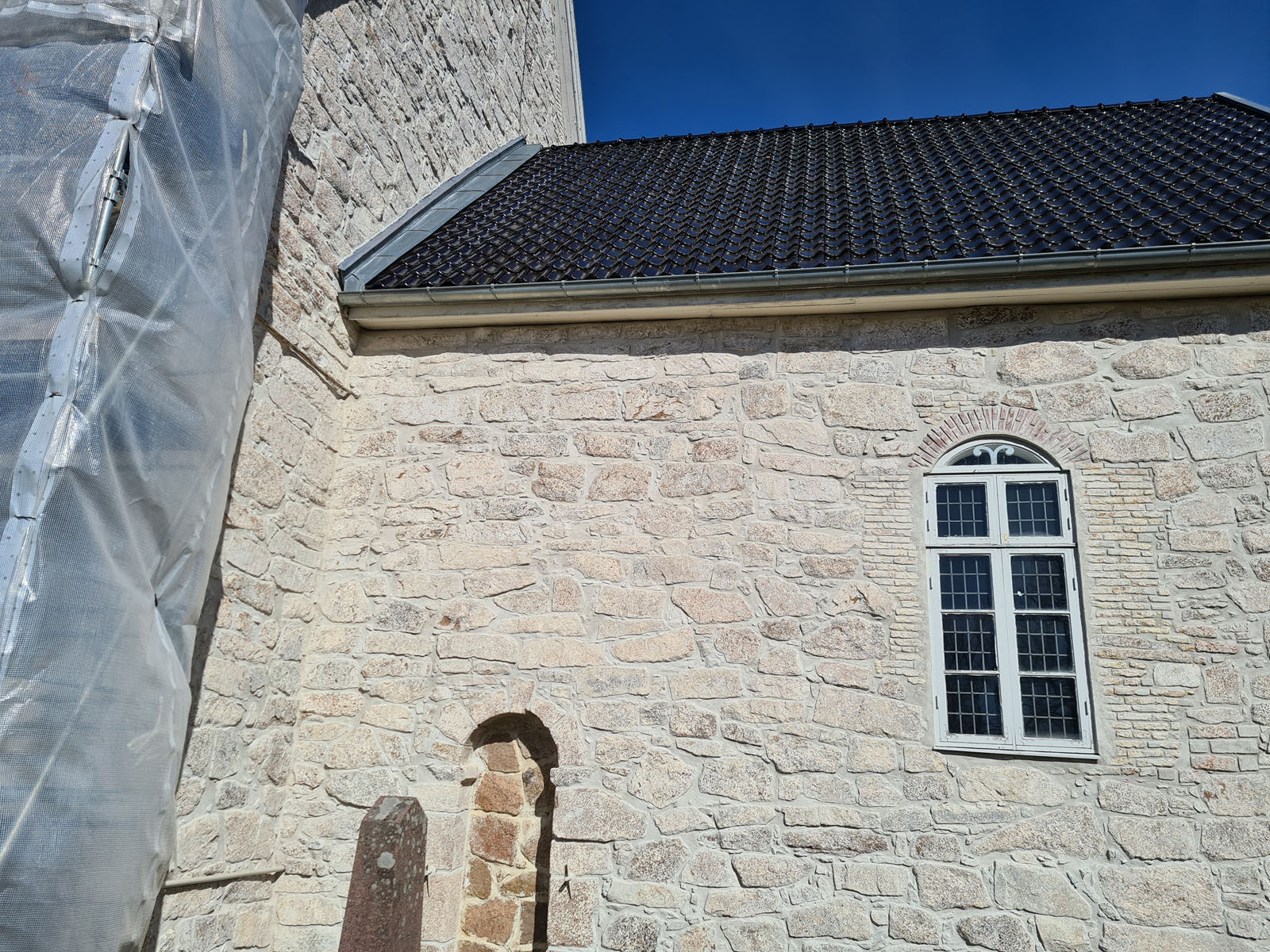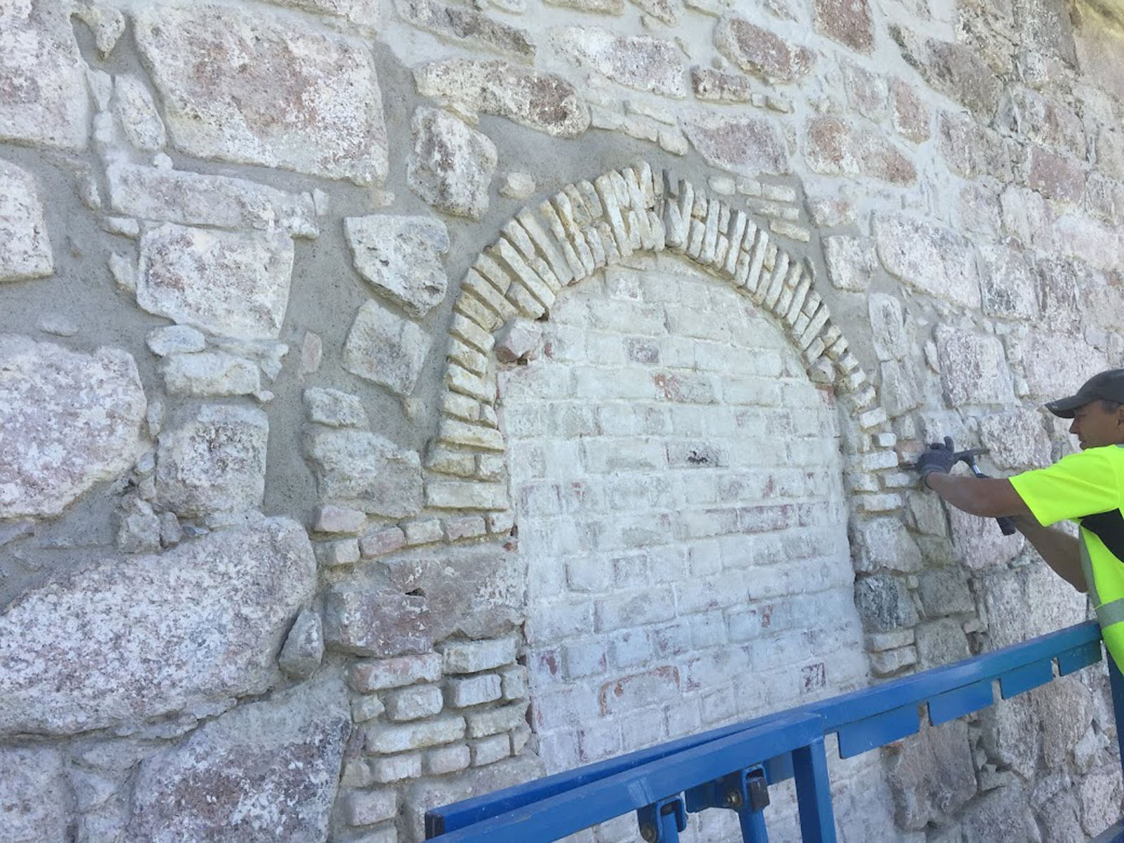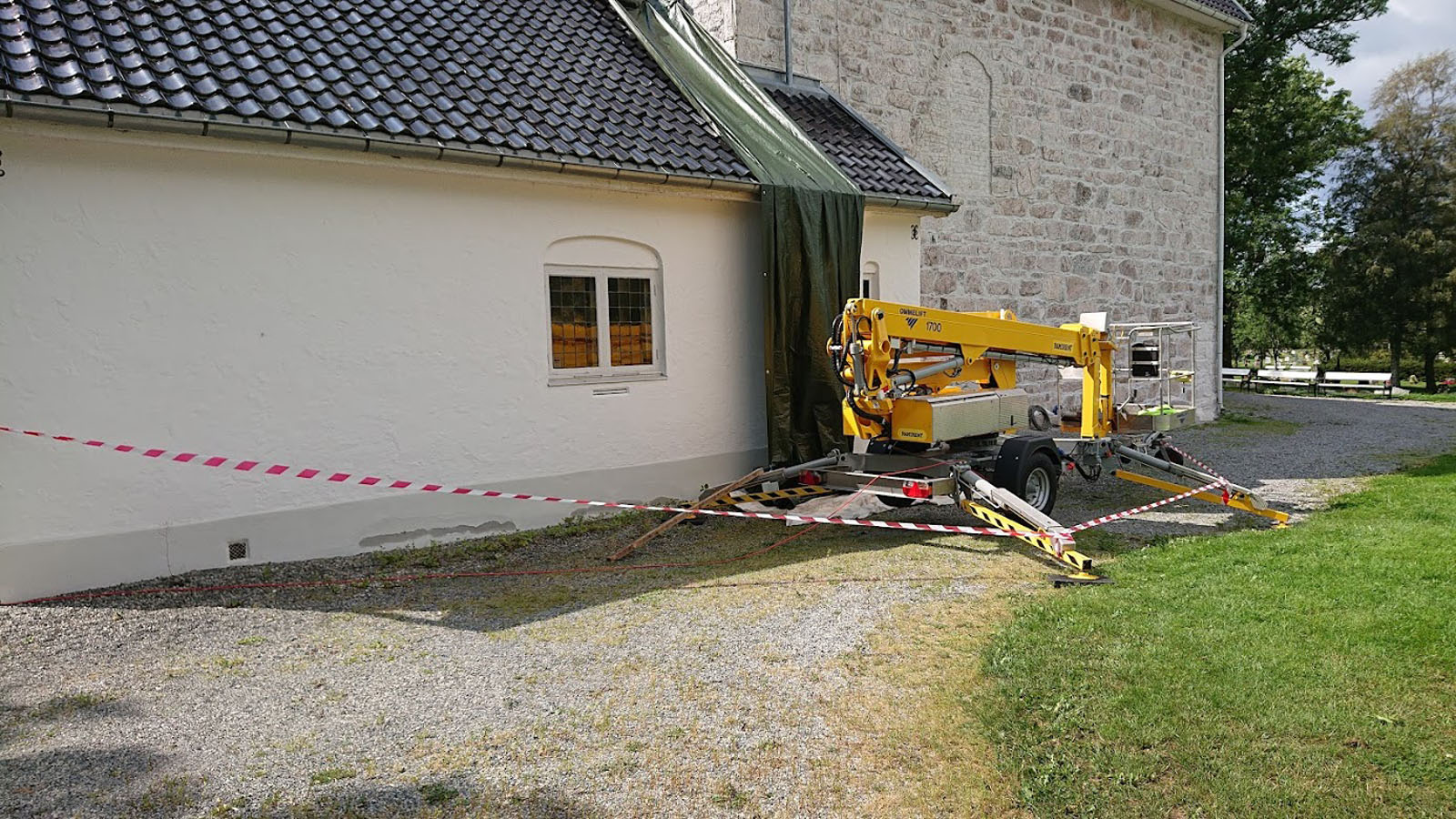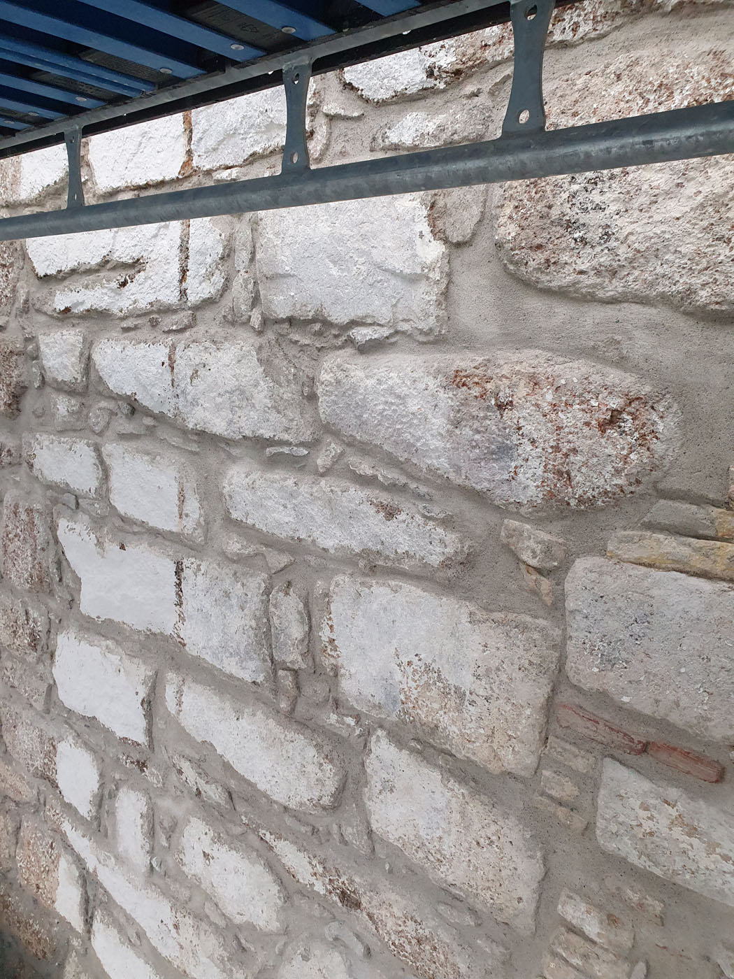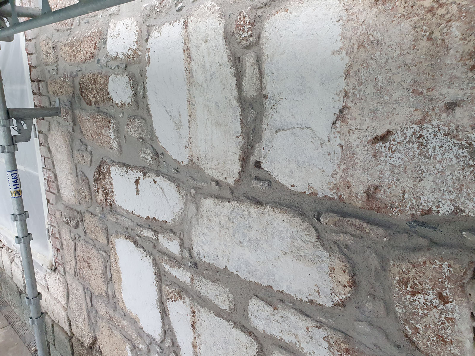Utbedring av fasader. Nedmeisling av all tidligere puss. Uthugging av all mørtel i fuger og re fuging.